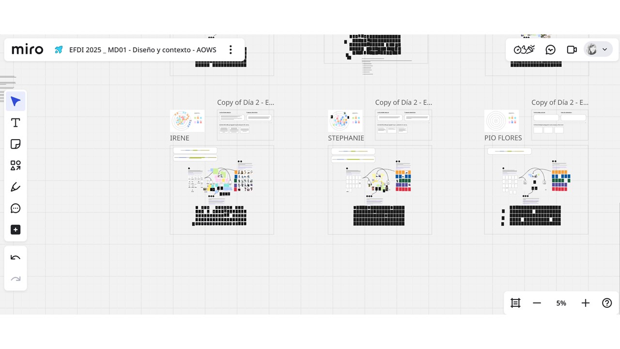 La idea es trabajarlo en un espacio de diseño donde se entrelazan diversos intereses, temas, estado del arte etc. Un espacio en el que podemos encontrar e hilar estas ideas, donde fundamentamos la reflexión a partir de estos datos visuales. Como espacio de diseño usamos Miro. Esta página colaborativa ya la conocía previamente por trabajos en la universidad, donde también lo empleamos con el mismo fin.