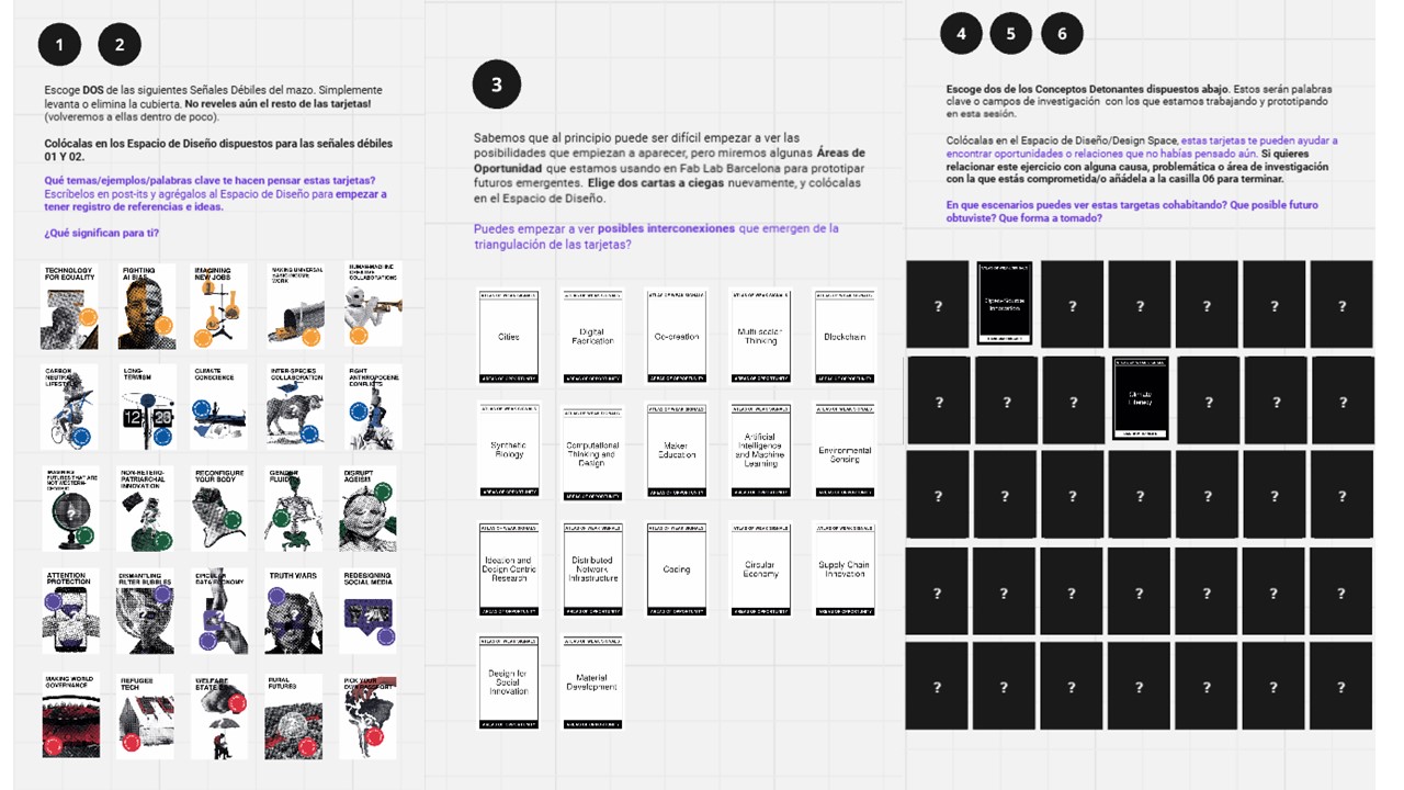 Entonces esta herramienta ATLASOWS nos permite identificar esas oportunidades de intervención, con un sustento basado en una idea/hipótesis, en el marco del Diseño de Futuros Emergentes. Vamos viendo puntos de interés, conceptos actuales, escenarios posibles conforme se va dando el juego de sacar las cartas, guiándonos de forma dinámica. La herramienta consta de 4 grupos de cartas / elementos que se van relacionando entre sí: - SEÑALES DÉBILES (weak signals) - ÁREAS DE OPORTUNIDAD (areas of opportunity - DETONANTES ALEATORIOS(random triggers). - RETOS DE DISEÑO ESPECÍFICOS(specific design challenges) esta aún no esta puesta en el tablero