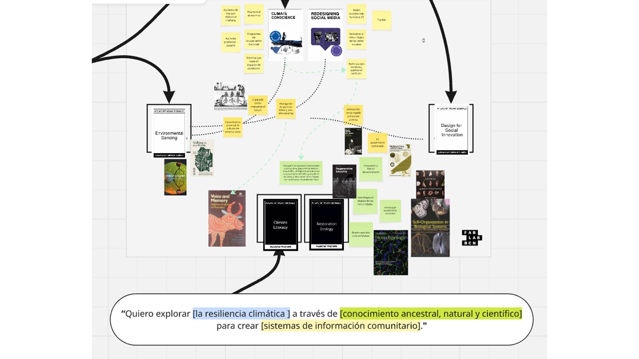 Apartir de la secuencia de estas etapas, se va armando poco a poco un mapa interconectado. Conforme iba sacando las cartas, coloque conceptos asociados, imágenes y referencias, para luego redactar nuevas relaciones encontradas. Nuevamente importante recordar que esta herramienta no pide como resultado un proyecto específico, sino mas bien, un mapa - atlas - cartografía de estas ideas que pueden derivar en un tema de exploración sustentado. Entonces en mi caso, los tópicos macros que salieron de este juego fueron ligados al clima, ecología, conciencia climática, repensar las rrss, detección de datos para monitoreo de elementos del medio ambiente y diseño para la innovación social. A partir de estos planteo la posible intervención que sigue la secuencia interés / tema / oportunidad: