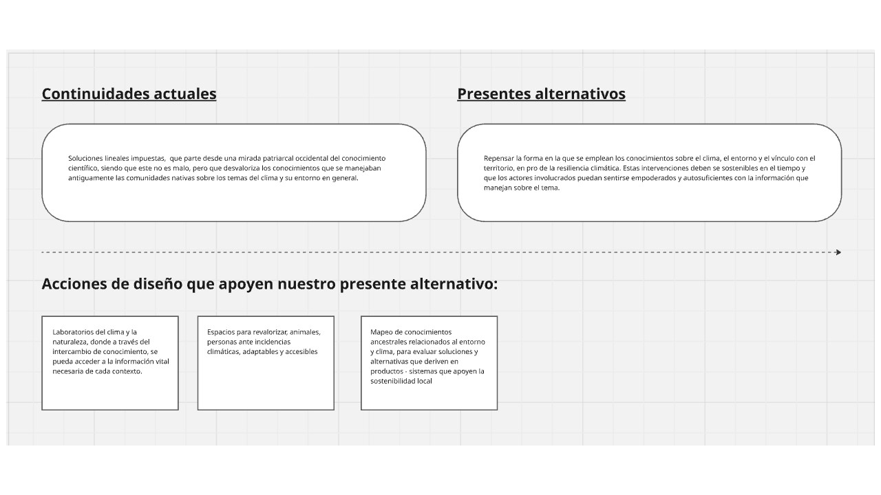 Posteriormente, se redactaron sustentos y propuestas a partir de a partir de 3 componentes secuenciales: Continuidades actuales - Presentes alternativos, Acciones de diseño que apoyen el presente alternativo.