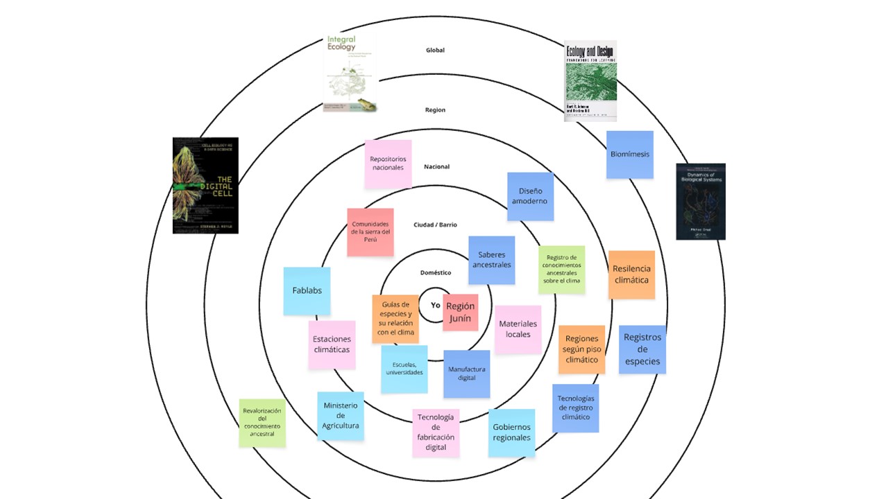 Para complementar, se genera un espacio de diseño multiescalar, donde se plantean 6 realidades desde lo individual, local, nacional a lo macro a partir de 6 categorías que permiten organizar la información. La idea es aterrizar el proyecto planteándolo en un posible escenario realista, clasificando los tópicos de interés, estado del arte. infraestructura, materiales/suministros, tecnologías/metodologías y posibles contextos de intervención.