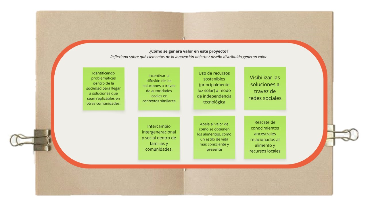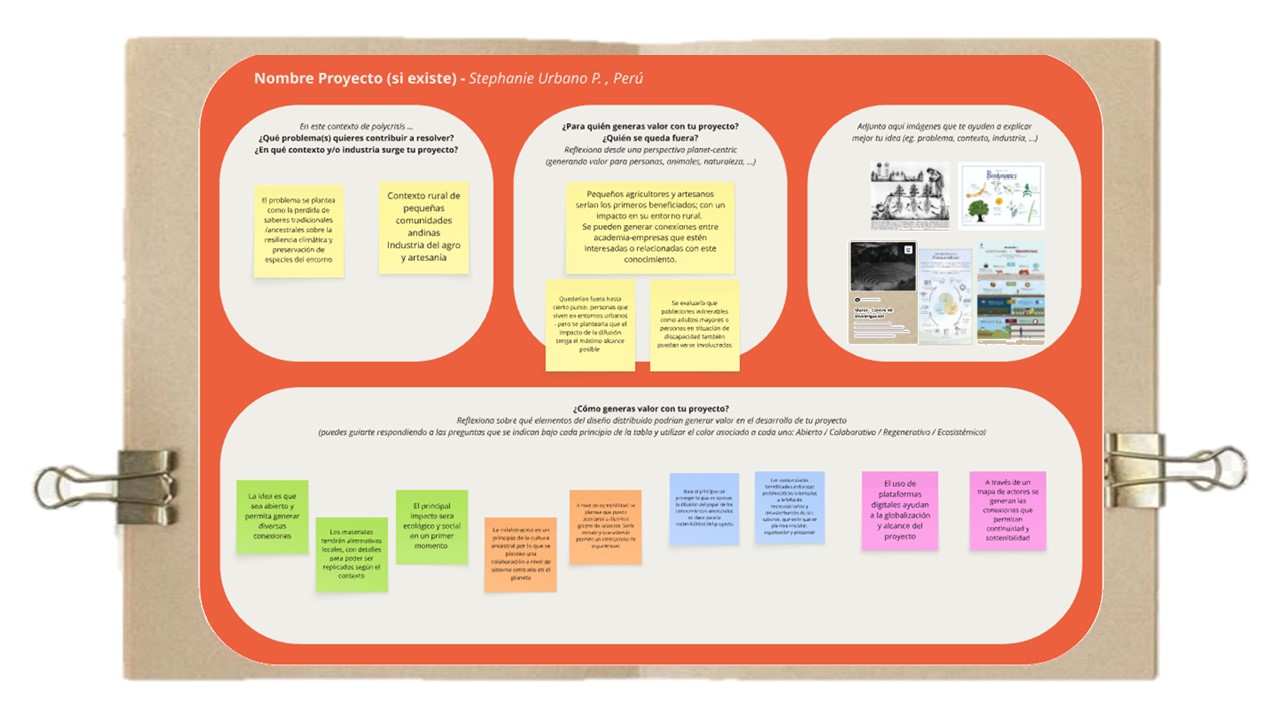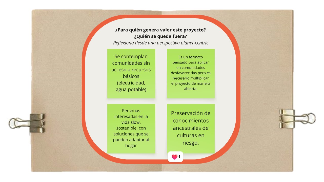 En especial el apartado de ¿Quién se queda afuera? Y ¿Cómo generas valor con tu proyecto? Me sirvió para indagar de forma más consciente y aterrizada, el verdadero impacto que quiero realizar, teniendo en cuenta principios del diseño regenerativo y colaborativo. Por ejemplo, la colaboración es un principio de la cultura ancestral por lo que se plantea rescatar esta cosmovisión, acercarla al contexto actual y fomentar la participación de otros actores, cambiando también la forma en la que se relacionan entre ellos. Parte importante es que además el enfoque abierto se manifieste en la documentación, divulgación y materialización del proyecto, garantizando su sostenibilidad.