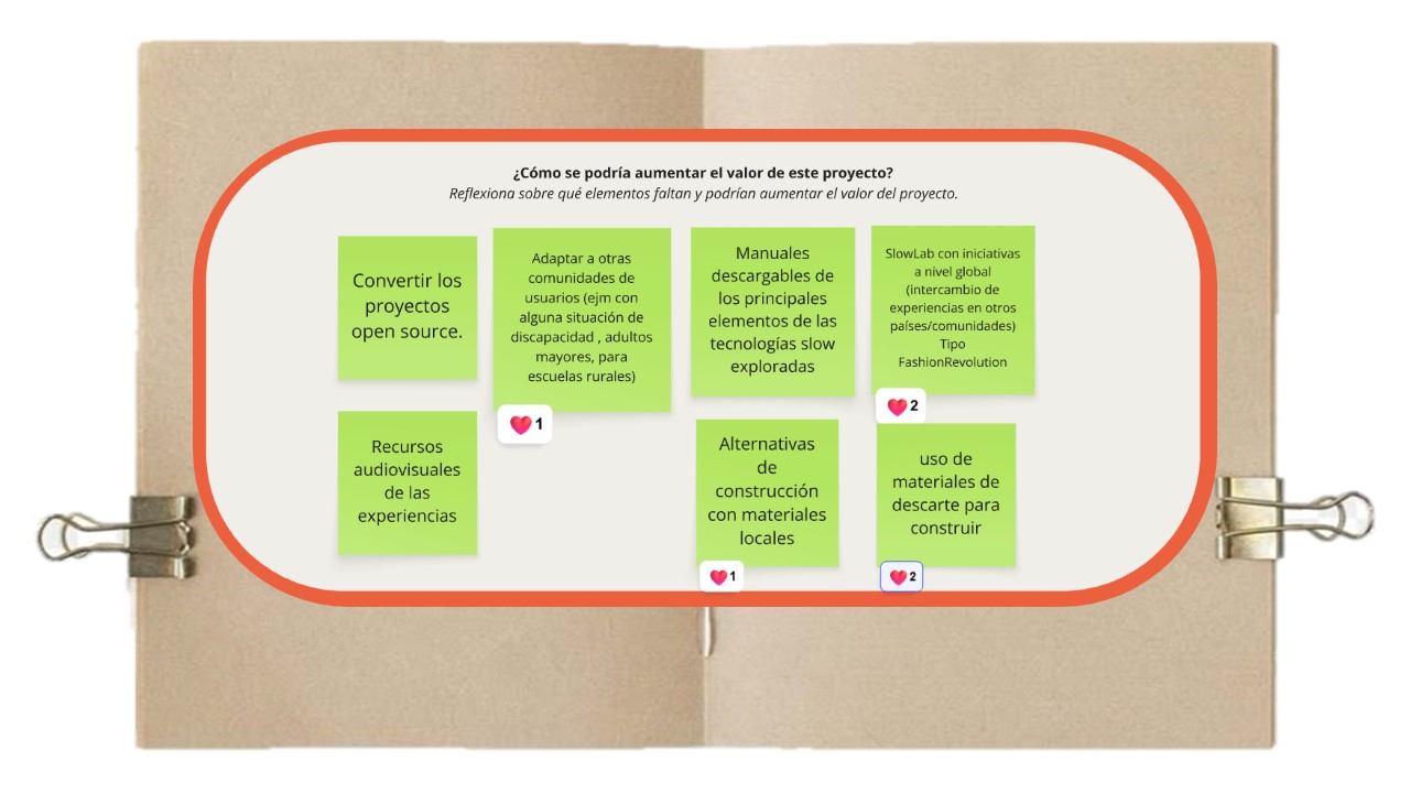Qué importante fue pensar y analizar para quiénes están enfocado los proyectos que realizamos y quienes se benefician, así como quienes se quedan fuera. Es necesario considerar que algunos actores (humanos y no humanos) pueden verse afectados de alguna u otra manera, de quiénes se esta cubriendo ciertas necesidades y por qué no de otros. Con el grupo, debatimos entonces sobre este punto y el core que tenía Slow Lab al orientar sus esfuerzos en este tema.