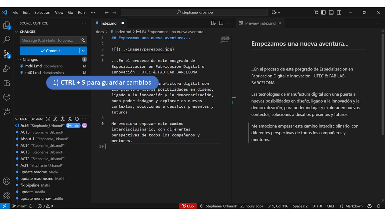 Anteriormente, en la formación de Fabriacademy, tuve la oportunidad de familiarizarme con el proceso de creación a través de Github y Visual Studio Code. La tarea era similar, pues debía crear una página para poder registrar el proceso. En cierta forma esto me ayudo a interiorizar lo visto en las primeras sesiones y se me hizo más llevadera la información. Puede ser el caso que para quién ve por primera vez temas de programación y lenguaje HTML, llega a ser un poco intimidante, hasta que continuas adentrándote con el proceso…