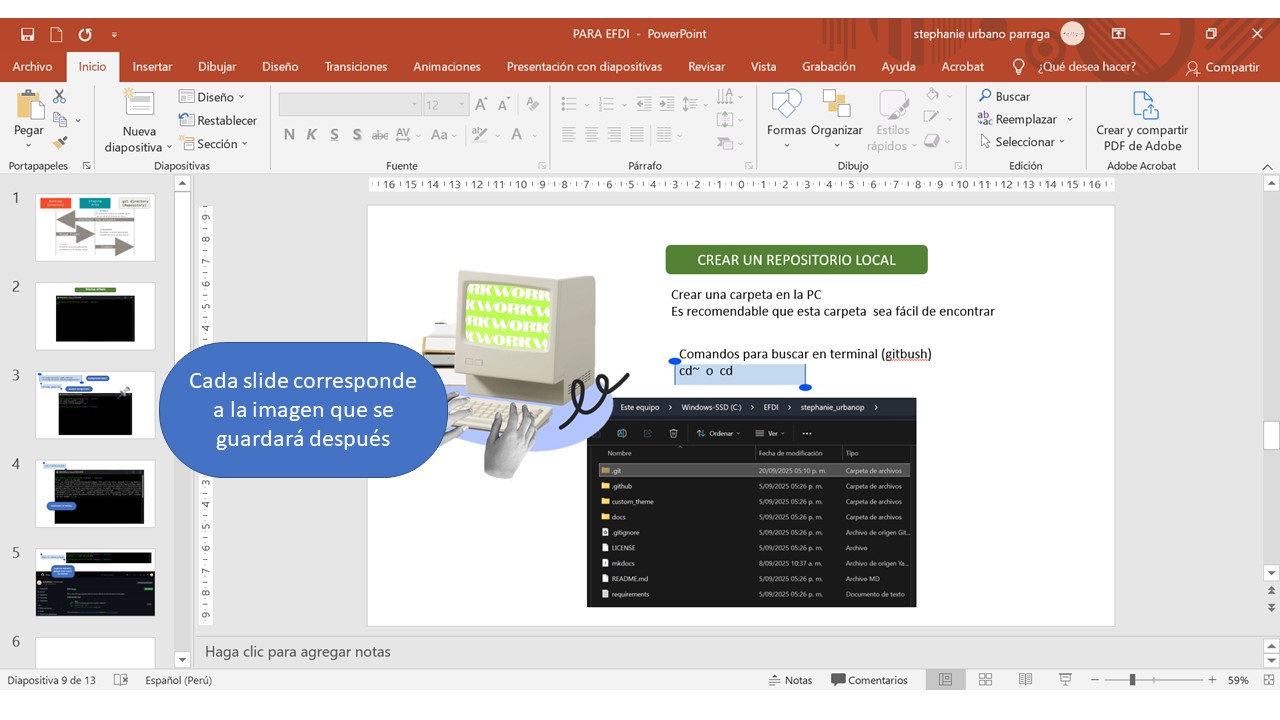 Por otro lado, me sirvio tener un bitácora digital en Power Point, para registrar screens y notas, que luego al guardar en bloque de imágenes, la numeración ayudó a insertarlas de manera más efectiva. Además de quedar con el peso del archivo y tamaño apropiados. También hacer alguna edición en la diapositiva que correspone, guardar y automaticamente se actualiza también en el vínculo que coloqué previamente.