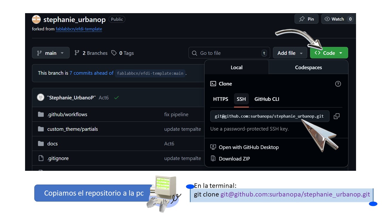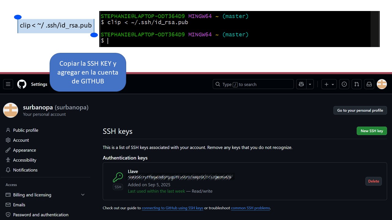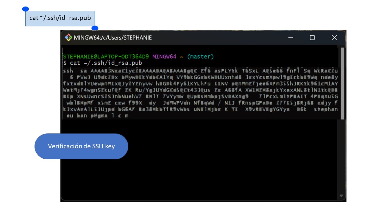 El paso de la vinculación de la llave lo resalto porque permite una conexión rápida, segura. Me preguntaba porque es tan compleja y tiene sentido pues hace que sean bastante difíciles de descrifrar, por lo que brinda mayor seguridad que contraseñas tradicionales durante la interacción de servidores y ejecución de comandos. En mi caso, debido a lo realizado para el Fabriacademy, ya contaba con una SSH key, por lo que tuve que buscarla y vincularla en Github.