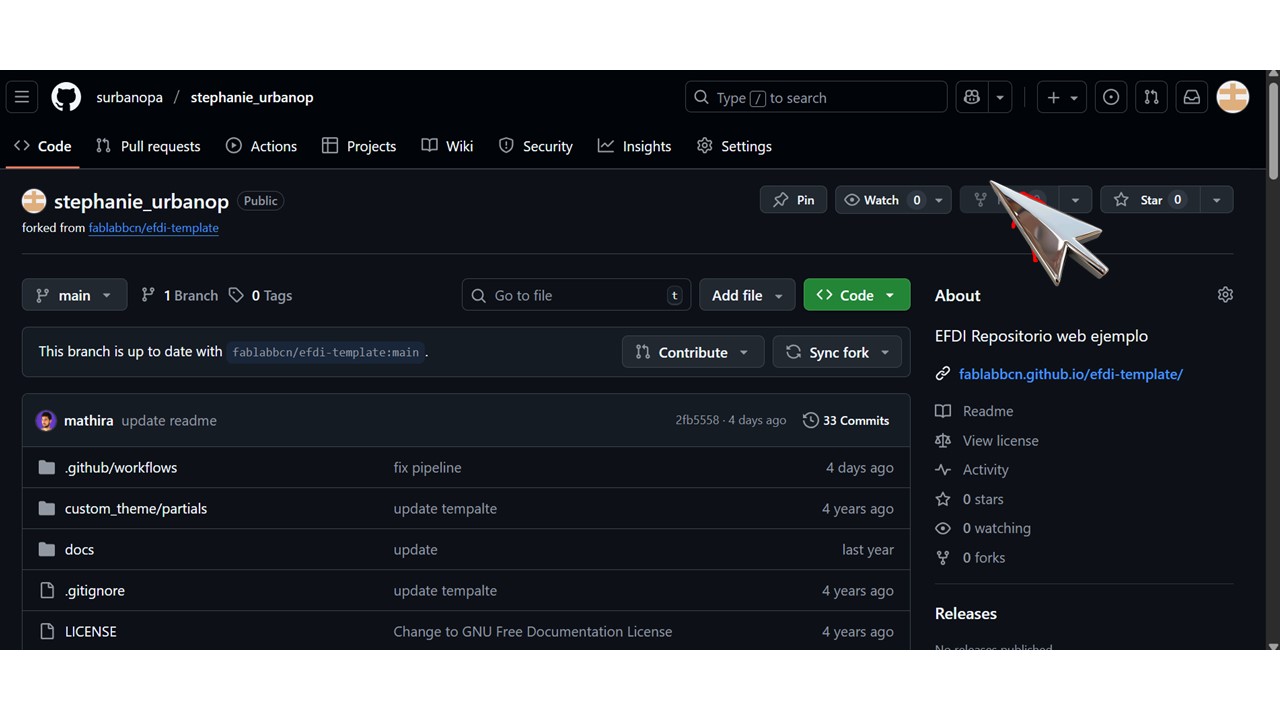 En la cuenta se crea un fork del template para usar en el repositorio propio. Es decir ya no empezamos de cero, pero si hay que realizar las configuraciones respectivas y posterior personalización, que se puede realizar directamente también en esa página.