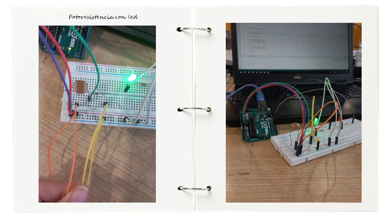Programar el Arduino para que lea una fotoresistencia conectada a un pin analógico. Si la luz ambiente es alta, debe encenderse un LED. Si la luz es baja, debe encenderse otro LED diferente. Solo uno de los dos LEDs debe estar encendido a la vez. Además, el valor leído debe mostrarse en el Monitor Serie
